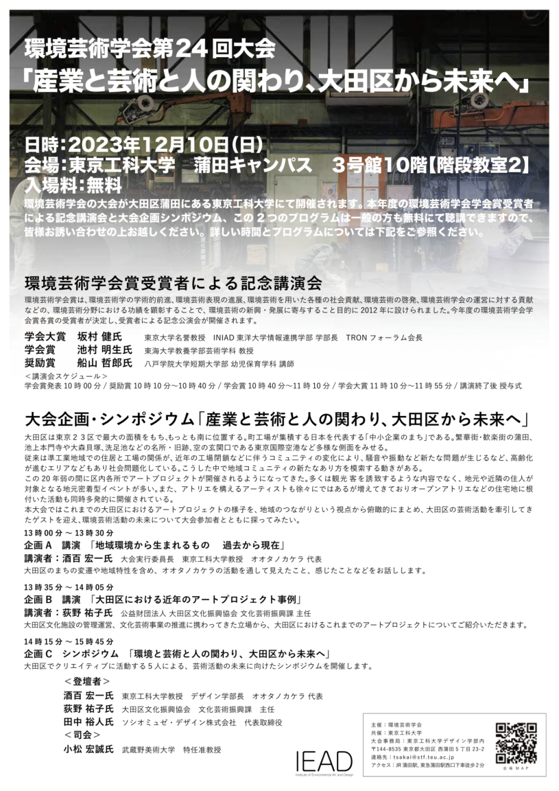 本大会ではこれまでの大田区におけるアートプロジェクトの様子を、地域のつながりという視点から俯瞰的にまとめ、大田区の芸術活動を牽引してきたゲストを迎え、環境芸術活動の未来について大会参加者とともに探ってみたい。